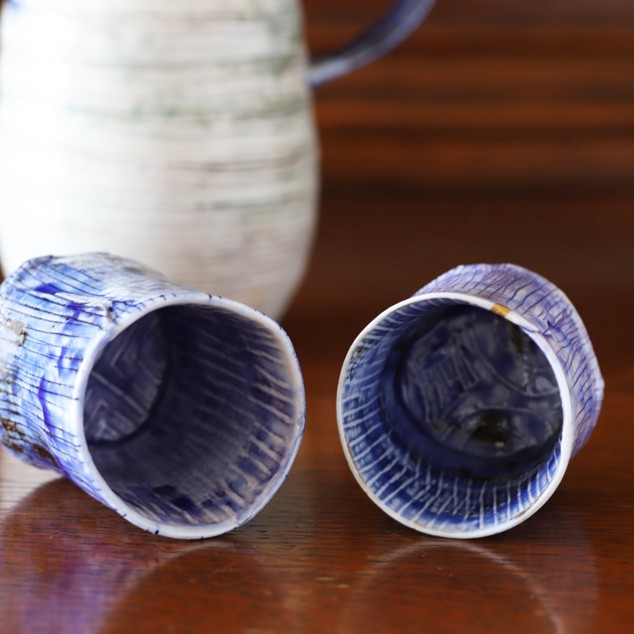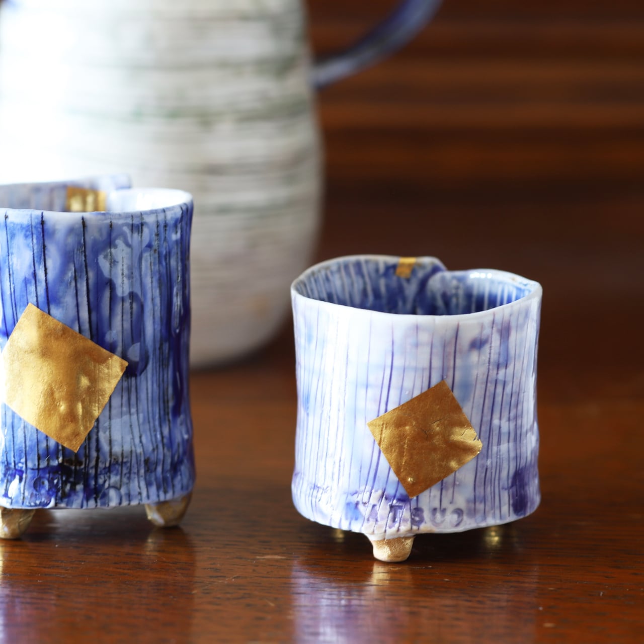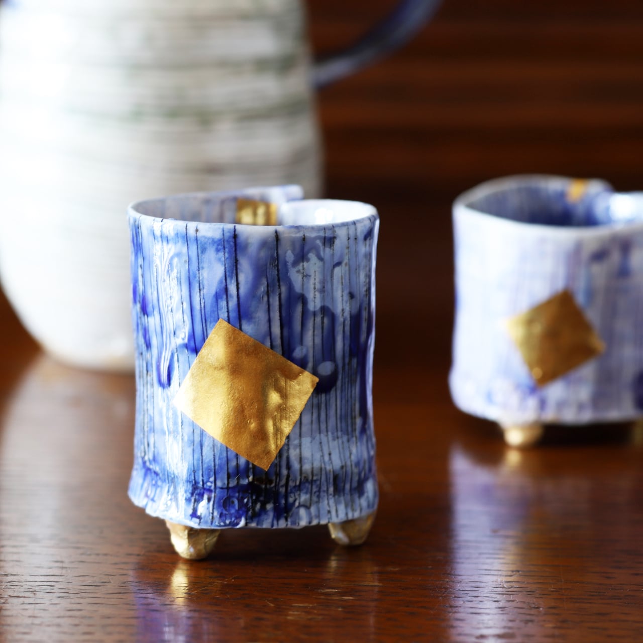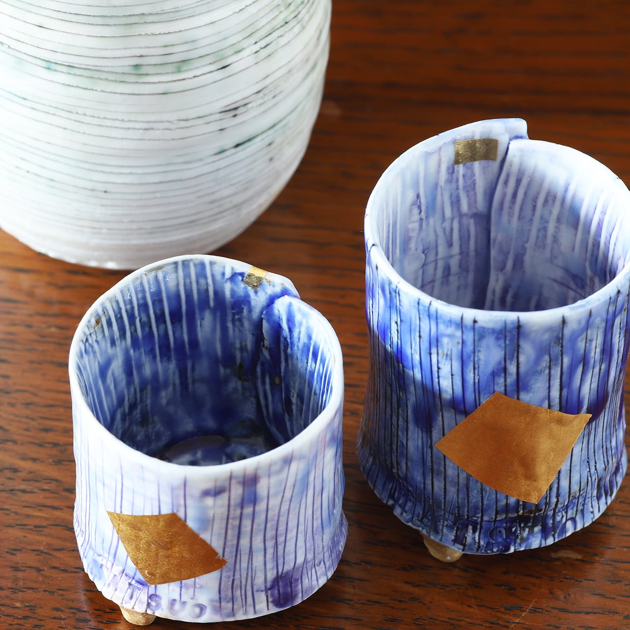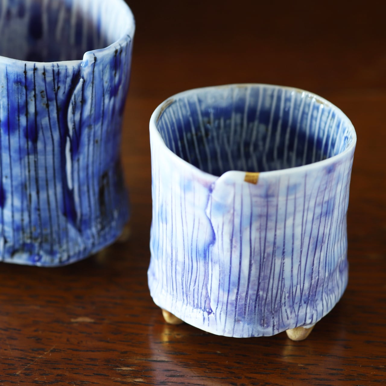ぐい吞みは、三つ足のかわいらしい造形が特徴的。手に収まりのよい大きさと軽やかなバランス感で、思わず毎日使いたくなる存在です。白地に紫交じりの線文が揺れ、もう一客は瑠璃がぐっと深まり、金彩がその深みを一層引き立てています。対になるようでいて、それぞれ個性があり、手仕事ならではの表情の違いを楽しめる組み合わせです。