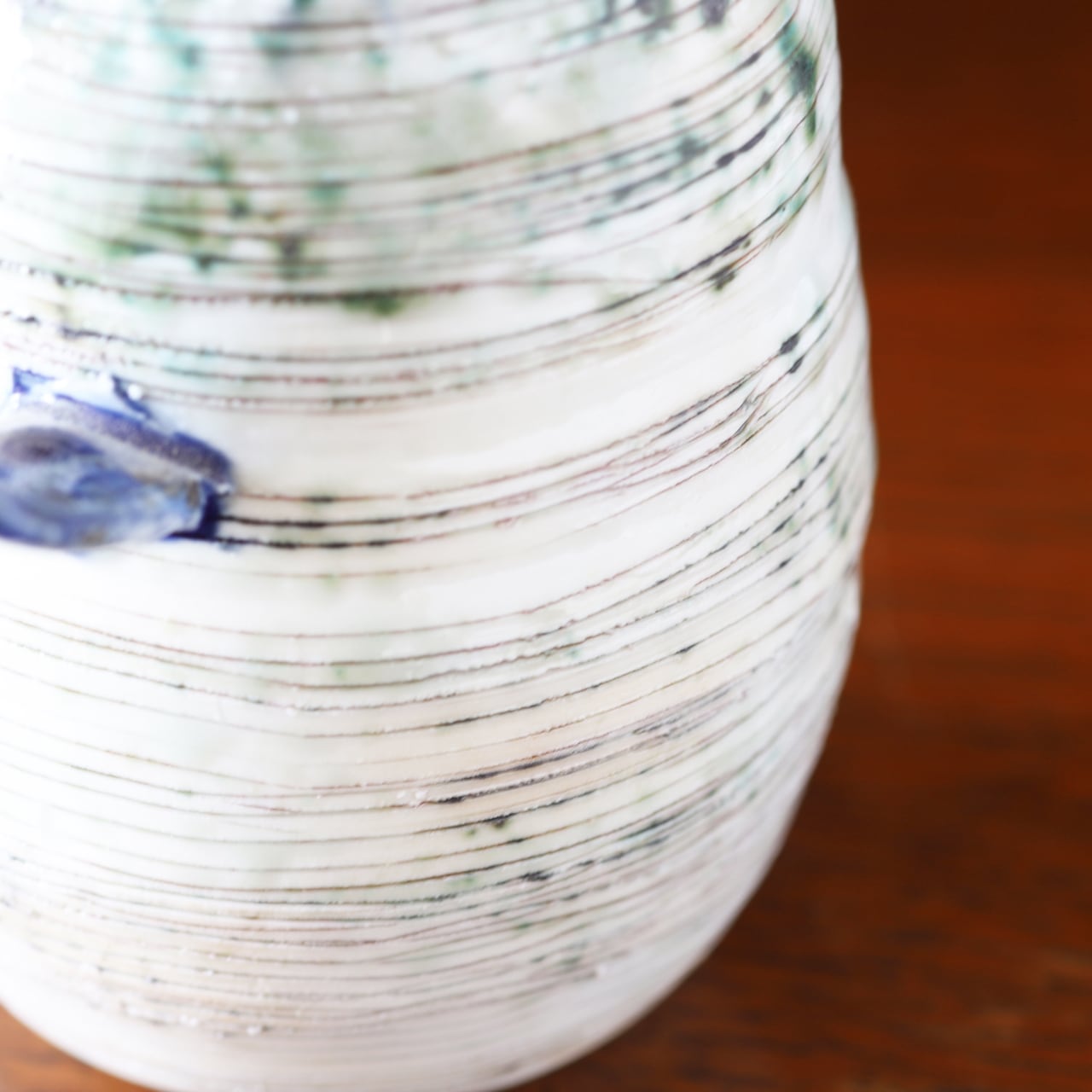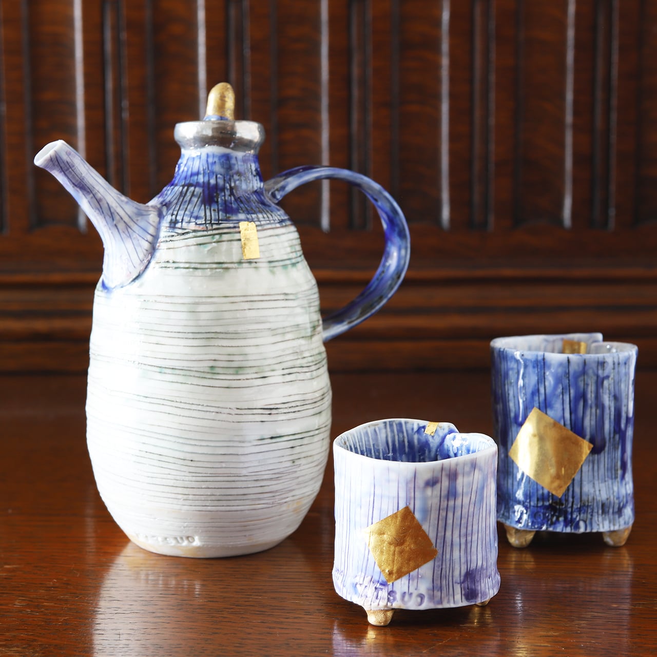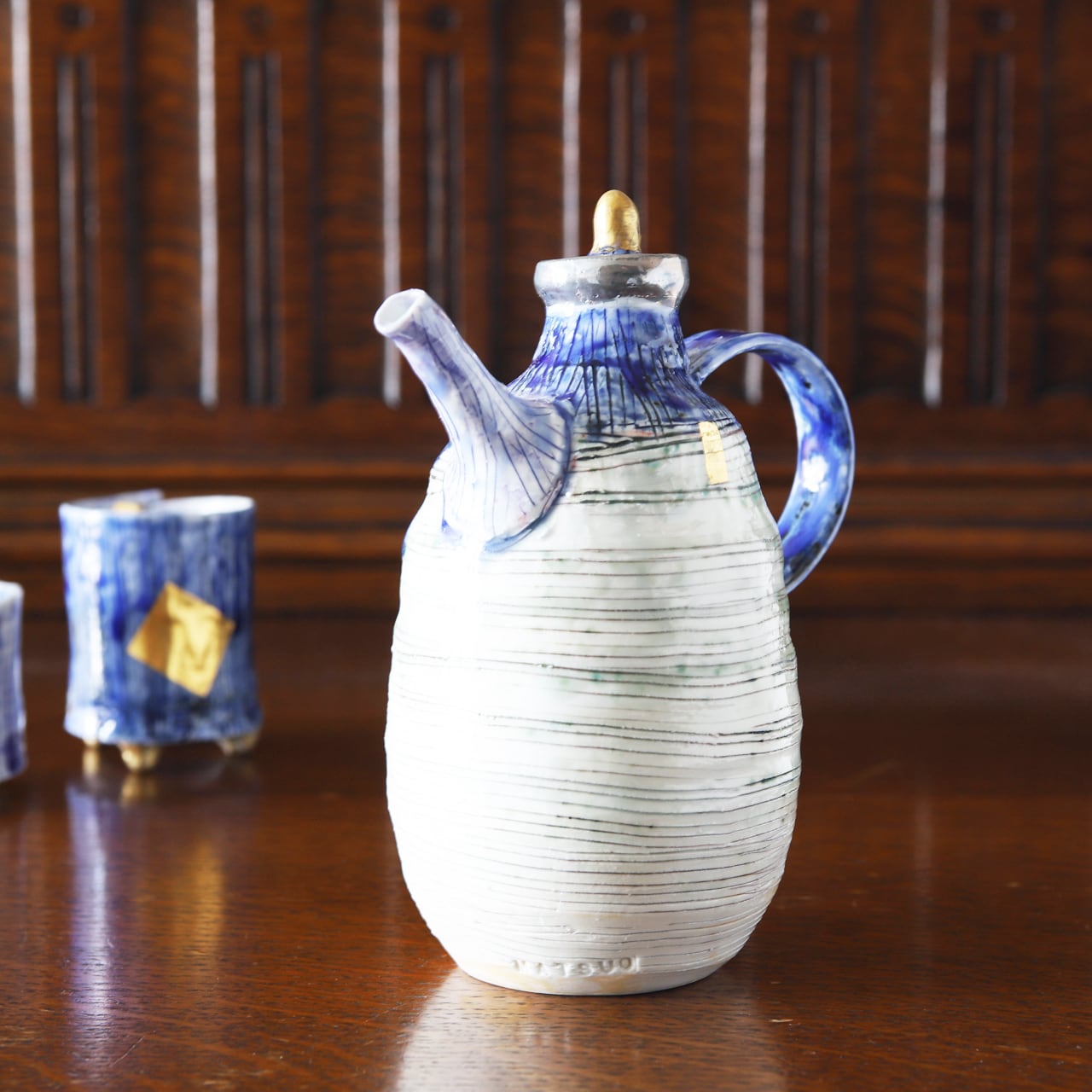 写真でもご覧いただけるように、注器は柔らかな白地に細かな線文が重なり、肩から口元にかけては瑠璃色が溶け込むように広がっています。動きのある筆致は、まるで器の上に風が流れているような軽やかさ。そこに小さく施された金箔が、全体の表情を引き締める美しいアクセントになっています。持ち手や注ぎ口のつくりも丁寧で、酒を注ぐ時間が一層心地よく感じられる形です。