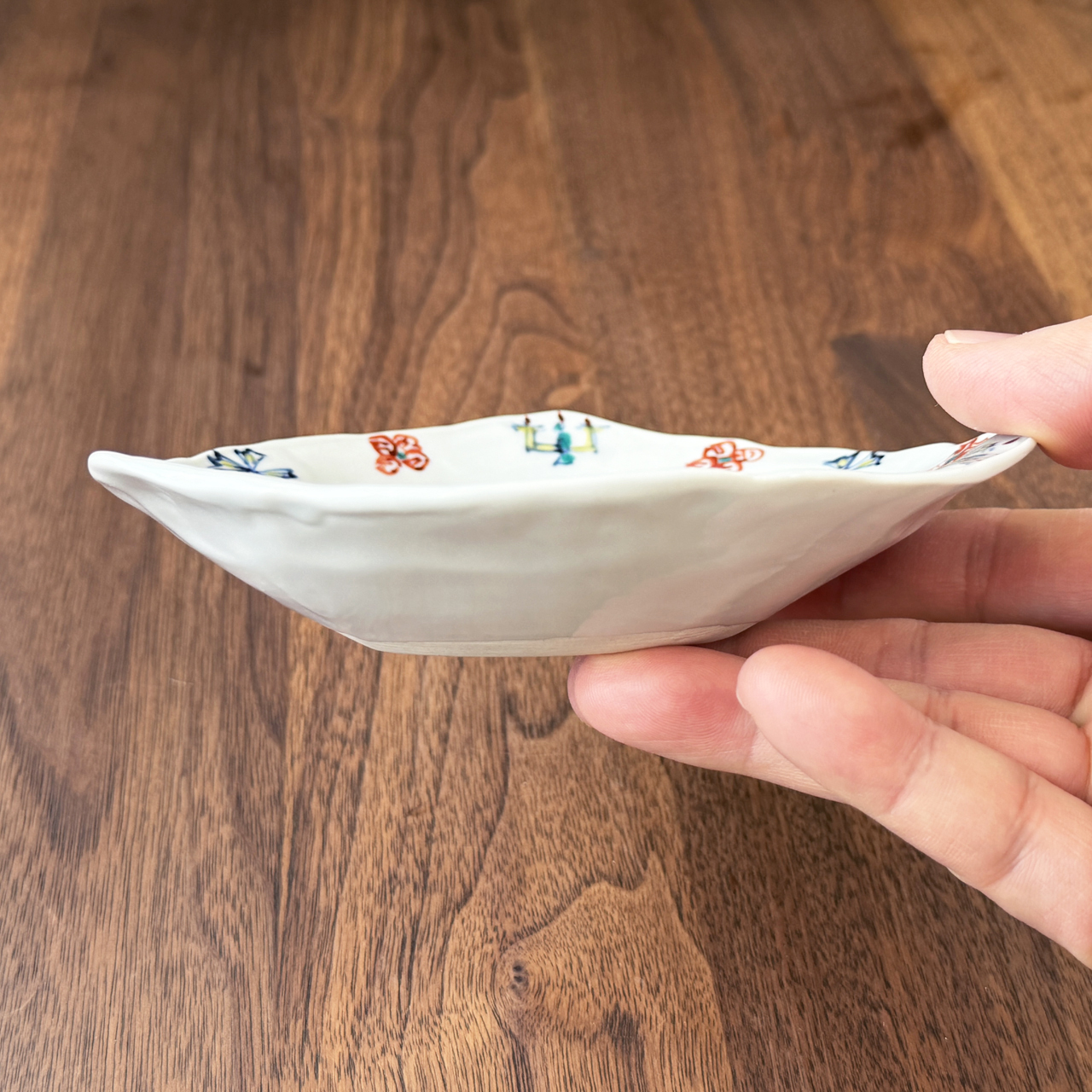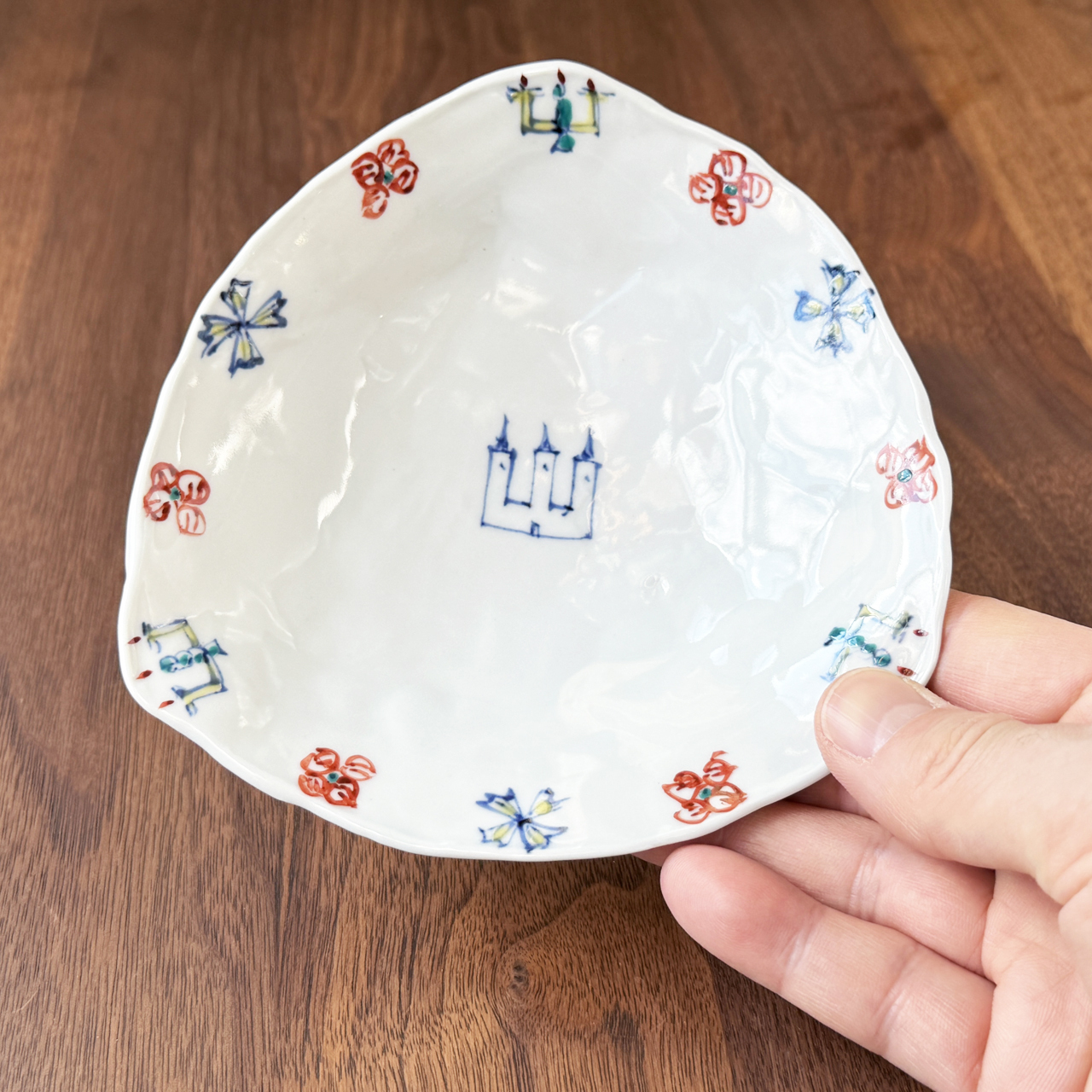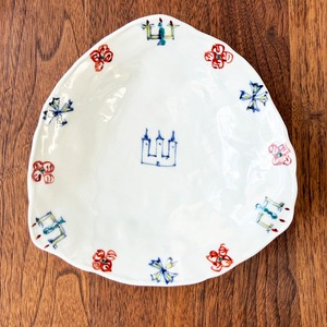 「 三角皿 | NO,1 赤絵渕唐草 NO,2 芙蓉手 No,3お城図 NO,4染錦花蝶図 No,5赤絵松竹梅」1枚3,850円 全5種類
