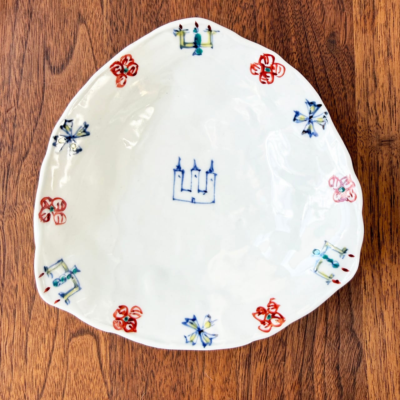 この美しい三角形のお皿は、貞土窯の松尾貞一郎・松尾三希子夫妻によって手掛けられた作品です。