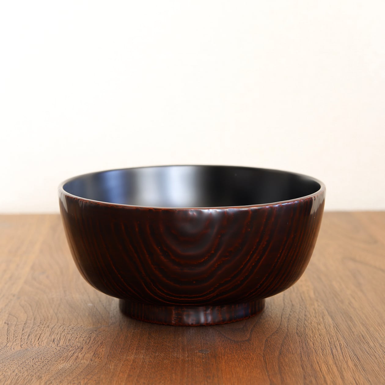 外側は赤みを帯びた黒で、口部と高台部分にはより強い赤みが。栗の木の美しい木目に赤みが交じり合い、独特の表情を持っています。内側は黒一色で落ち着いた印象です。